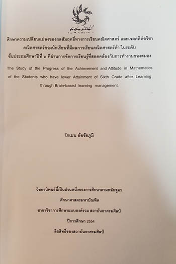 Summary: การวิจัยครั้งนี้มีวัตถุประสงค์ 1. เพื่อศึกษาผลสัมฤทธิ์ทางการเรียนคณิตศาสตร์ของนักเรียนที่มีผลสัมฤทธิ์ทางการเรียน คณิตศาสตร์ต่ำ ในระดับชั้นประถมศึกษาปีที่ 6 ที่ผ่านการจัดการเรียนรู้ที่สอดคล้องกับการทำงานของสมอง 2. เพื่อศึกษาเจตคติต่อวิชาคณิตศาสตร์ ของนักเรียนที่มีผลสัมฤทธิ์ทางการเรียนคณิตศาสตร์ต่ำใน ระดับชั้นประถมศึกษาปีที่ 6 ที่ผ่านการจัดการเรียนรู้ที่สอดคล้องกับการทำงานของสมอง 3. เพื่อศึกษาพัฒนาการของเจตคติต่อวิชาคณิตศาสตร์ ของนักเรียนที่มีผลสัมฤทธิ์ทางการเรียน คณิตศาสตร์ต่ำในระดับชั้นประถมศึกษาปีที่ 6 ที่ผ่านการจัดการเรียนรู้ที่สอดคล้องกับการทำงานของสมอง 4. เพื่อศึกษาความสัมพันธ์ระหว่างผลสัมฤทธิ์ทางการเรียน และเจตคติต่อวิชาคณิตศาสตร์ ของ นักเรียนที่มีผลสัมฤทธิ์ทางการเรียนคณิตศาสตร์ต่ำ ในระดับชั้นประถมศึกษาปีที่ 6 ที่ผ่านการจัดการเรียนรู้ ที่สอดคล้องกับการทำงานของสมอง ประชากรที่ใช้ในการวิจัยครั้งนี้เป็นนักเรียนระดับชั้นประถมศึกษาปีที่ 6 กลุ่มที่มีผลสัมฤทธิ์ทางการ เรียนคณิตศาสตร์ต่ำ โรงเรียนรุ่งอรุณ ปีการศึกษา 2553 สังกัดสำนักงานคณะกรรมการส่งเสริมการศึกษา เอกชน จังหวัดกรุงเทพมหานคร โดยตัวอย่างประชากรที่ใช้ในการวิจัยครั้งนี้ ผู้วิจัยเลือกตัวอย่างประชากร โดยเทคนิคการสุ่มแบบเจาะจง(Purposive sampling) เป็นนักเรียนระดับชั้นประถมศึกษาปีที่ 6 กลุ่มที่มี ผลสัมฤทธิ์ทางการเรียนคณิตศาสตร์ต่ำ โรงเรียนรุ่งอรุณ ปีการศึกษา 2553 จำนวน 24 คน ซึ่งมีเครื่องมือที่ ใช้ในการวิจัยคือ แบบทดสอบวัดผลสัมฤทธิ์ทางการเรียนคณิตศาสตร์ แบบวัดเจตคติต่อวิชาคณิตศาสตร์ และแบบสังเกตเจตคติต่อวิชาคณิตศาสตร์ วิเคราะห์ข้อมูลด้วยด้วยค่าสถิติโดยคำนวณค่ามัชฌิมเลขคณิต ส่วนเบี่ยงเบนมาตรฐาน ค่ามัชฌิมเลขคณิตร้อยละ และค่าที ( t-test) ผลการวิจัยมีดังนี้ 1. ผลสัมฤทธิ์ทางการเรียนวิชาคณิตศาสตร์ ของนักเรียนที่มีผลการเรียนคณิตศาสตร์ต่ำ ในระดับ ชั้น ประถมศึกษาปีที่ ๖ ก่อนและหลังการจัดการเรียนรู้ที่สอดคล้องกับการทำงานของสมอง แตกต่างกันอย่างมีนัยสำคัญทาง สถิติที่ระดับ .00 ซึ่งสูงกว่าระดับนัยสำคัญที่ตั้งไว้ที่ .05 แสดงว่าผลการเรียนคณิตศาสตร์ ทั้งสองช่วงแตกต่างกันอย่าง เชื่อถือได้ 2. เจตคติต่อวิชาคณิตศาสตร์ ของนักเรียนที่มีผลการเรียนคณิตศาสตร์ต่ำ ในระดับชั้นประถม ศึกษาปีที่ ๖ ก่อน และหลังการจัดการเรียนรู้ที่สอดคล้องกับการทำงานของสมอง แตกต่างกันอย่างมีนัยสำคัญทางสถิติที่ .05 แสดงว่าเจตคติ ของนักเรียนทั้งสองแตกต่างกันอย่างเชื