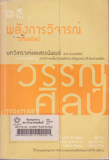 พลังการวิจารณ์ : วรรณศิลป์ / รื่นฤทัย สัจจพันธุ์ : ผู้วิจัย ; ชมัยภร แสงกระจ่าง และ อรพินท์ คำสอน : ผู้ร่วมวิจัย |