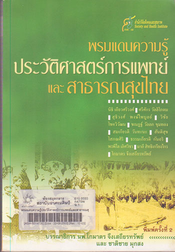 พรมแดนความรู้ประวัติศาสตร์การแพทย์และสาธารณสุขไทย : เอกสารสรุปผลการประชุมระดมความคิดเห็นทางวิชาการด้านประวัติศาสตร์การแพทย์และสาธารณสุขไทย วันที่ 19 กรกฎาคม พ.ศ. 2544 ณ ห้องประชุมสถาบันวิจัยระบบสาธารณสุข อาคาร 3 ชั้น 5 ตึกกรมสุขภาพจิต กระทรวงสาธารณสุข นนทบุรี / แผนงานวิจัยสังคมและสุขภาพ สำนักนโยบายและแผนสาธารณสุข และสถาบันวิจัยระบบสาธารณสุข ; บรรณาธิการ โกมาตร จึงเสถียรทรัพย์ และ ชาติชาย มุกสง