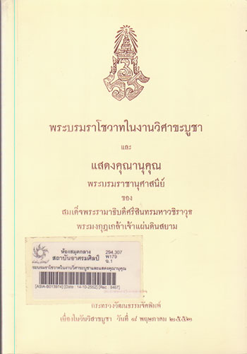 พระบรมราโชวาทในงานวิศาขะบูชาและแสดงคุณานุคุณพระบรมราชานุศาสนีย์ของ สมเด็จพระรามาธิบดีศรีสินทรมหาวชิราวุธมงกุฎเกล้าเจ้าแผ่นดินสยาม / กระทรวงวัฒนธรรม