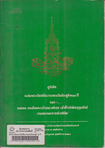 สูจิบัตรเฉลิมพระเกียรติในวาระครบวันประสูติ 100 ปี ของจอมพลสมเด็จ พระเจ้าบรมวงศ์เธอเจ้าฟ้าบริพัตรสุขุมพันธ์ กรมพระนครสวรรค์วรพินิจ / โดยกระทรวงศึกษาธิการ และสำนักงานเสริมสร้างเอกลักษณ์ของชาติ